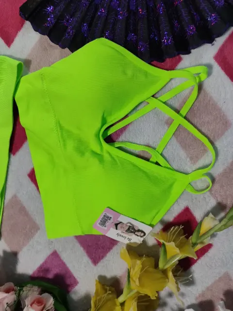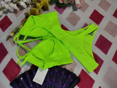 Conjunto de lencería Neón. •Te interesa? Escucho ofertas•Deseas varias prendas? armo tu paqueteConjunto de lencería Amarillo fosfo, tela rib, con stretch (licra). Tanga con puente de algodón. Top, copas preformadas, tirantes cruzados en la espalda. Unitalla.