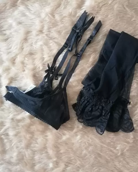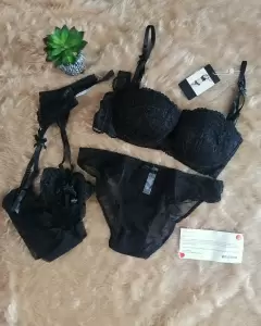 Conjunto de 4 piezas brazier, pantaleta, liguero y medias color negro talla M