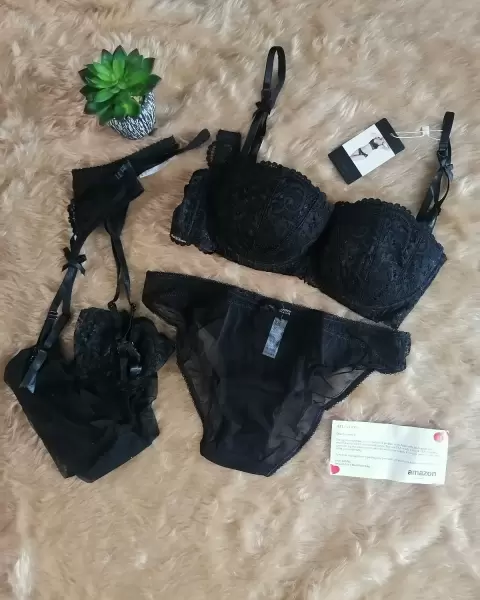 Conjunto intimo color negro. Conjunto de 4 piezas brazier, pantaleta, liguero y medias color negro talla M
