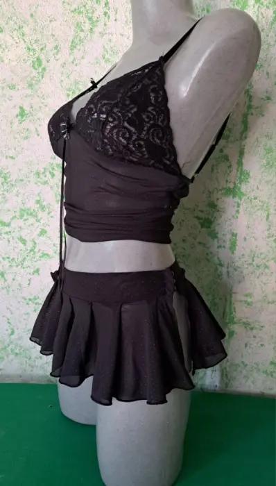Conjunto negro sexy microfalda y blusa. Bonito y sexy conjunto de microfalda y blusa de tirantes, la falda tiene botones para abricharse en ambos costados, la blusa tiene las copas de encaje, la tela de ambas prendas tiene pequeños brillos, la tela tiene tolerancia a estirarse, es talla chica- mediana, se encuentra en buen estado.