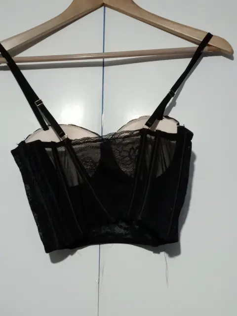 Lindo coordinado de encaje negro, brasier tipo corset con tanga, talla 32 B, marca JLO, el brasier se abrocha de costado