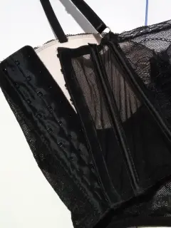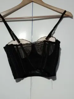 Coordinado de encaje. Lindo coordinado de encaje negro, brasier tipo corset con tanga, talla 32 B, marca JLO, el brasier se abrocha de costado