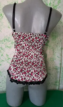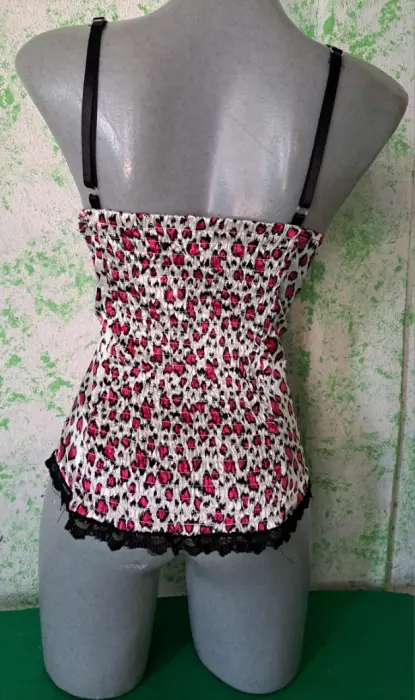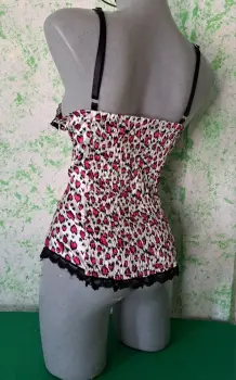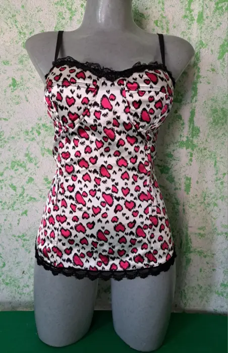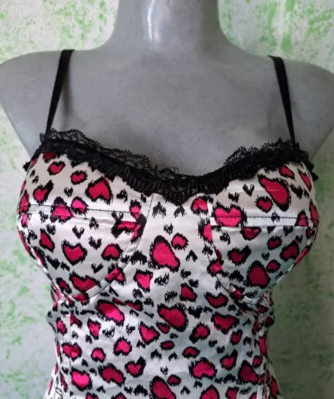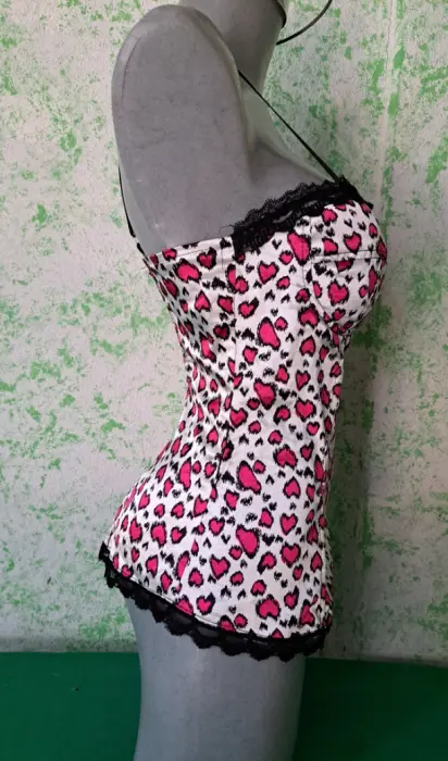 Hermoso corset blanco con estampado de corazones rosa, con toques de encaje que lo hacen lucir muy romántico y sexy, tiene cierre en el costado izquierdo y elástico en la espalda por lo que tiene tolerancia a estirar un poco, es talla Grande, se encuentra en perfecto estado, Marca MYTH.