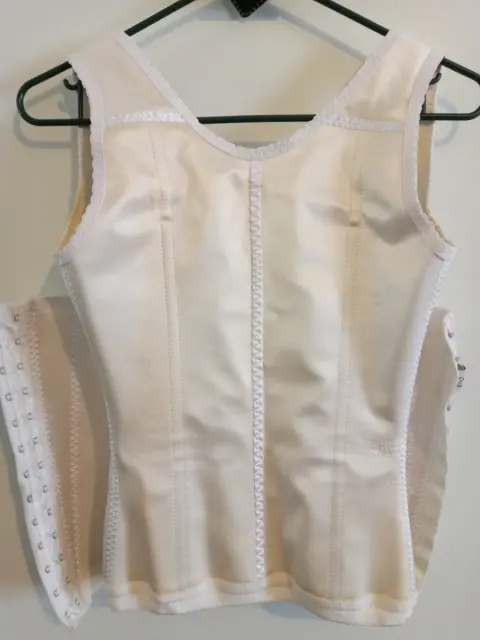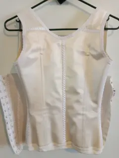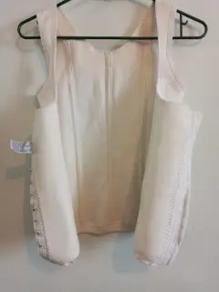 Faja tipo corsette, de tirantes, con dos posiciones para ajustar medida. Forro de algodón en la parte interior. Ayuda a moldear y a disminuir el talle, parte alta y baja de la espalda y vientre. Viene con su empaque original. Indica talla 30.