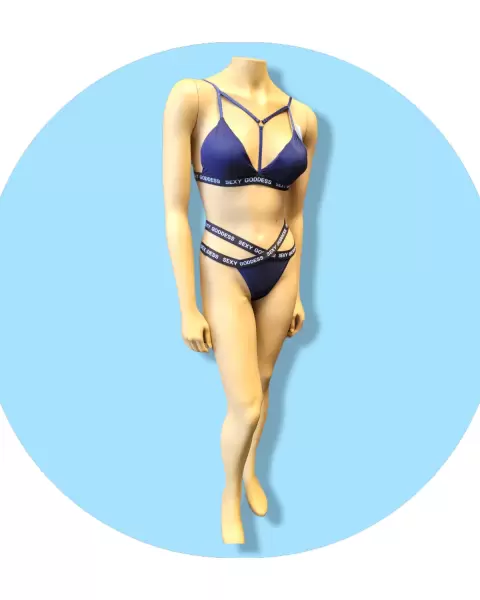 Rose Girl Sexy Goddes 2-Pcs Set. Rose Girl Sexy Goddes 2-Pcs Set, tamaño pequeño / mediano, color azul con correas elásticas estampadas en negro que dice Sexy Goddes, el sujetador es acolchado claro, estilo deslizante, elástico sexy cruzado, tirantes ajustables para los hombros, hechos de nylon y mezcla de spandex, nuevos sin etiqueta como mercancía de cierre en buenas condiciones.