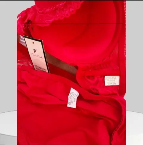 Set de 2-Piezas Panty y Brassier de Pick Pink, talla 42(XXL), color Rojo passion, con encajes de acento en Brassier y moño coquette en el Panty, hechos de licra y algodón, nuevos a estrenar con etiqueta en buen estado cosmetico.