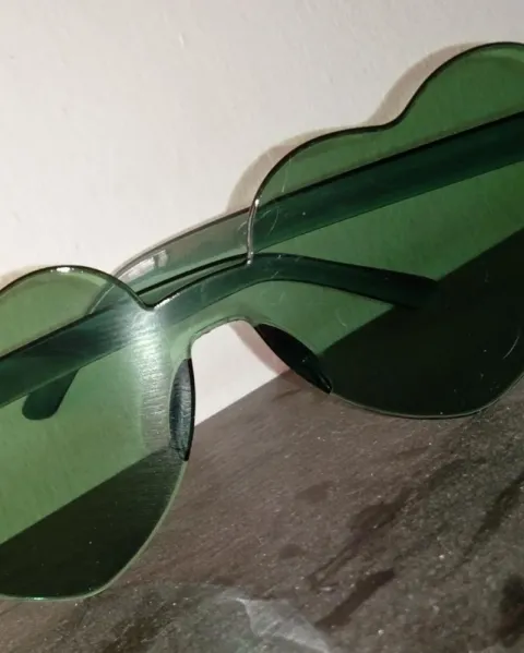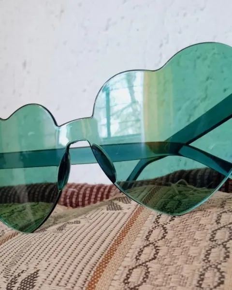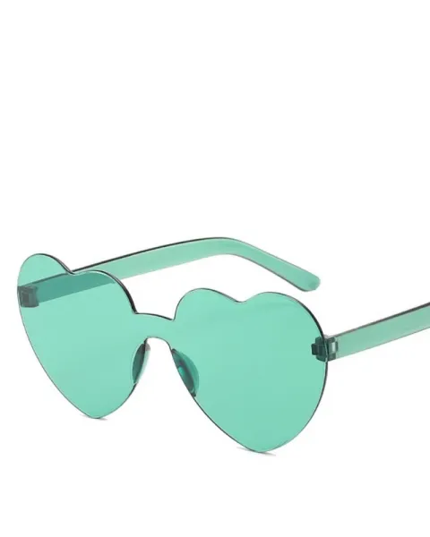 Lentes en forma de corazones verdes. Lentes de corazón sin marco. Tamaño grande, cubren muy bien el sol. Son ligeros y combinables.
