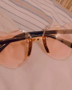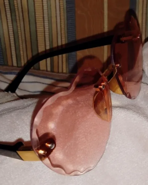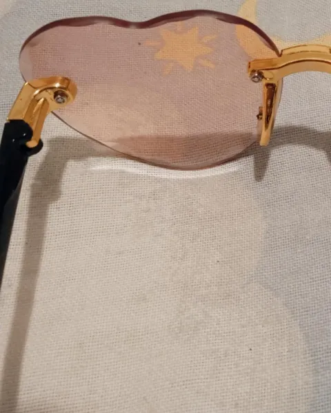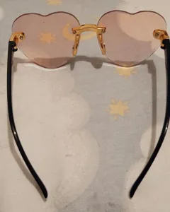 Bellos lentes de corazón en color rosa degradado, con detalles dorados. Son algo pequeños, para una cara delgada. Son ligeros y brillantes.