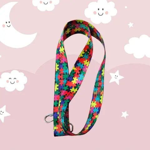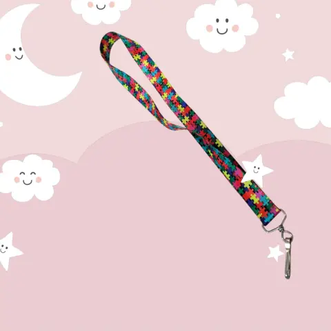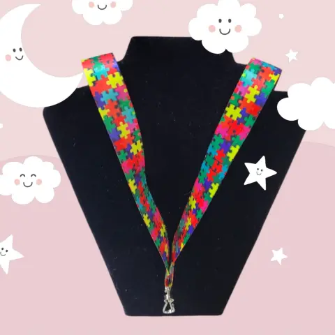 Collar Porta llaves/Gafete despertar conciencia del Autismo, hecho de fibro de tela con graficos del autismo, enhance de metal de acero inoxidable, mide 48cm de largo con 3cm de ancho nuevo a estrenar de productos con causa.
