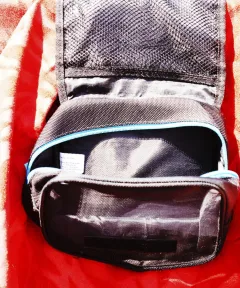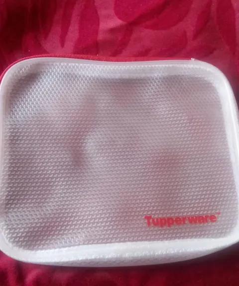 Lonchera de marca Tupperware, es pequeña para uso individual. a un costado tiene espacio para una botella de agua. Está muy bien cuidada