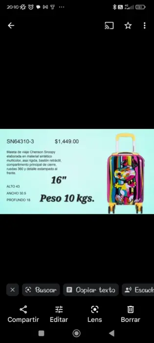 Maleta Snoopy. Nueva, original, hermosa maleta con etiqueta, para llevar arriba del avión hasta 10 kilos y es de 16'