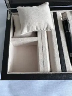 Caja de relojes y plumas en piel. Está hermosa caja en piel puedes guardar hasta 4 relojes y 3 plumas. Una pieza hecha en cuero natural hecha por artesanos mexicanos. Protege tus relojes y plumas. No contiene reloj ni pluma. Medidas:Alto 8.5 cmAncho 20 cmLargo 28 cm