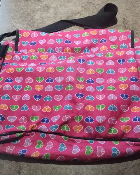 Preciosa mochila cruzada, casi nueva, muy poco uso, tiene un monton de bolsas y compartimentos. Diseño de corazones y amor y paz. 😊 ACEPTO OFERTAS ⚡⚡