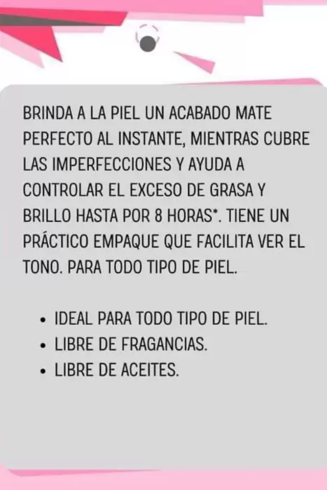 TIPS DE APLICACIÓN Aplica una pequeña cantidad de maquillaje en frente, mejillas, nariz y barbilla y distribuye uniformemente en el rostro aboyándote con la Esponja para Maquillaje Mary Kay®, la Brocha para Maquillaje Líquido Mary Kay® o la yema de tus dedos. BENEFICIOS: Ayuda a controlar el exceso de brillo hasta por 8 horas.Su cobertura flexible permite lograr desde una cobertura ligera hasta una completa y es fácil de aplicar.Práctico empaque que facilita ver el tono y cantidad de maquillaje.Dermatológicamente probado.Libre de aceite.Libre de fragancias.