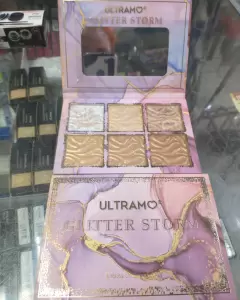 Bonita paleta de la marca ultramo, glitter storm 6 tonos de iluminadores, contiene espejo y caja de empaque original.