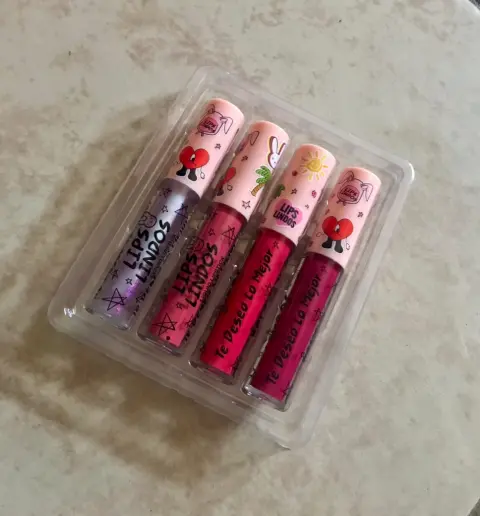 Kit de 4 labiales badBunny. El kit de labiales líquidos que contiene 3 labiales matte y 1 brillo, es perfecto para colocar en los labios con irresistibles tonos. Las texturas de los productos son fluidas, ligeras, extremadamente cómodas en los labios.Difíciles de conseguir, edición limitada