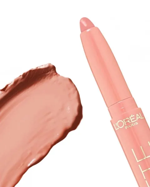 Labial Color Sesarional de Maybelline, color 405 pretty in Plum + Lápiz labial LE MATTE color Rosa de L’Oréal.