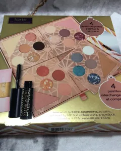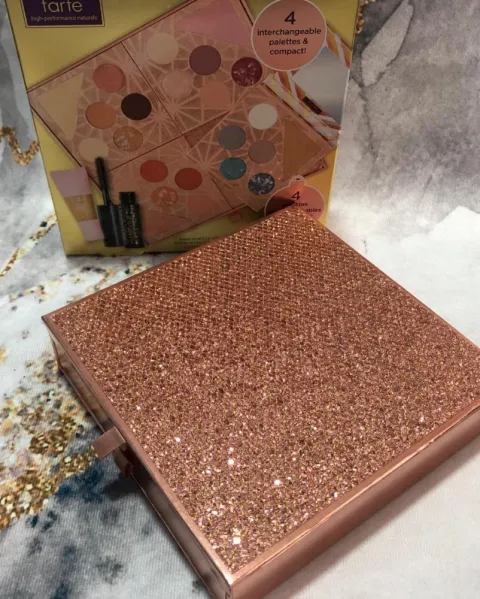 Baúl súper lindo edición especial Tarte Holidays contiene un rímel y glosa mini, 4 paletas con iluminador o rubor que puedes sacar individualmente en la paleta imantada que contiene. Tiene un espejo enorme de excelente calidad. Completamente nueva, original y con caja.