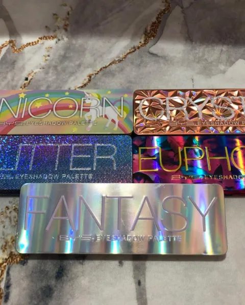 Colección de 5 paletas de sombras marca BYS, paleta unicornio,cristal,glitter,euphoria y fantasy. Contienen de todos los tonos y glitters para hacer diversos looks. Todas nuevas y con etiqueta.