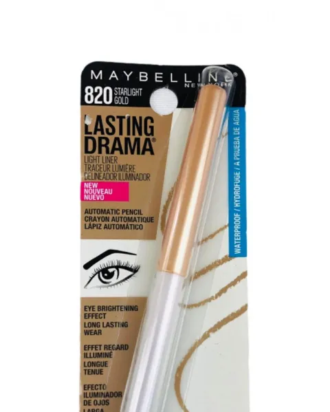 Delineador Starlight Gold Maybelline. Acentúa e ilumina tu ojos con pigmentos brillantes en color dorado, este delineador de ojos Lasting Drama 820 de Maybelline es de larga duración.
