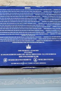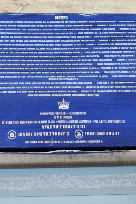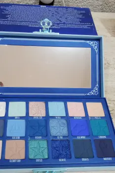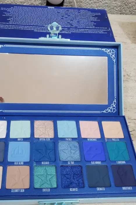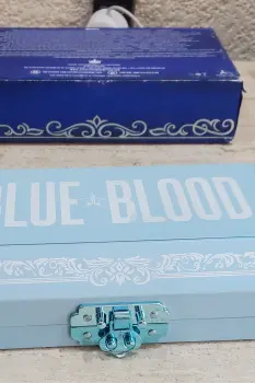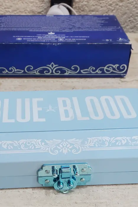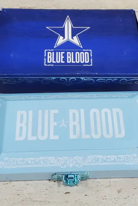 Jeffree Star Paleta Blue Blod. Esta paleta de sombras contiene 18 tonalidades hermosas en tonos mate y metalizados con una pigmentación increíble. La paleta de metal está inspirada en cajas de joyería de alta gama y ataúdes. Este es un producto vegano y libre de crueldad animal. Solo se hicieron algunas prubas de algunos colores y se desinfecto , esta practicamente nueva. La caja esta un poco maltratada.