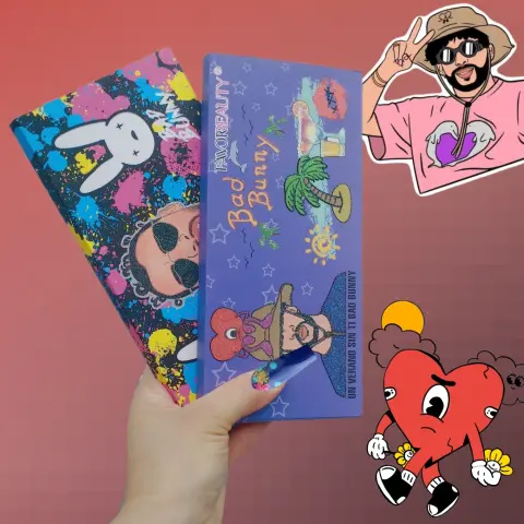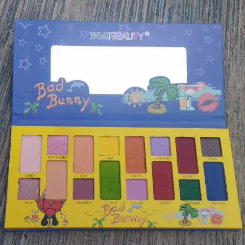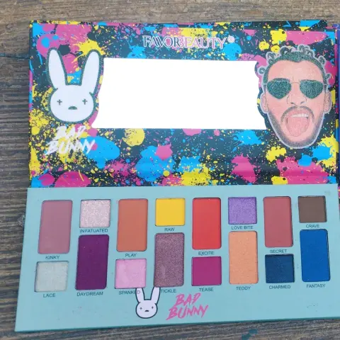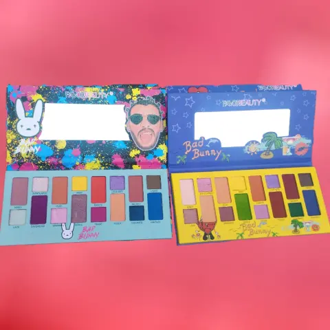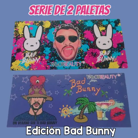 Paquete de 2 Paletas de Sombras Bad Bunny. Descubre la paleta de sombras Favor Beauty Edición Bad Bunny, con 16 tonos vibrantes y versátiles para crear looks únicos y atrevidos. Con esta paleta, podrás experimentar con diferentes combinaciones de colores y texturas para resaltar tu mirada de manera impactante. El formato compacto de la paleta la hace ideal para llevar contigo a donde quiera que vayas, ¡siempre lista para un retoque de color! La línea Bad Bunny te ofrece una selección de tonos inspirados en la personalidad y estilo del famoso cantante, para que puedas lucir un maquillaje auténtico y lleno de actitud.Contenido 2 paletas de sombras edición especial Bad Bunny.Cada una tiene 16 tonos de sombras, en total son 32 tonos diferentes.Luce tu estilo y destaca tu belleza!