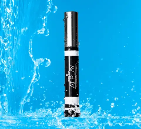 Rimel At Play. Máscara para pestañas (rimel) color negro, aprueba de agua, efecto alargador.