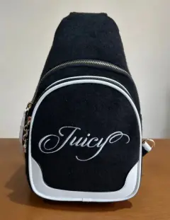 Backpack Juicy negro con blanco. Blackpack negro con blanco con una sola correa ancha y ajustar el largo y el lado que prefieras usarla. Diseño en forma de triángulo. Bolsas delanteras con cierre. Holograma bordado. Charm de la marca en forma de corazón. Medidas 20 cms de frente 33 cms de alto 8 cms de profundidad