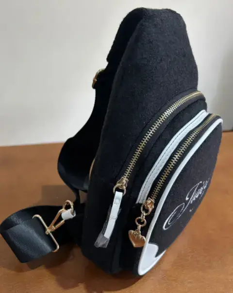 Blackpack negro con blanco con una sola correa ancha y ajustar el largo y el lado que prefieras usarla. Diseño en forma de triángulo. Bolsas delanteras con cierre. Holograma bordado. Charm de la marca en forma de corazón. Medidas 20 cms de frente 33 cms de alto 8 cms de profundidad