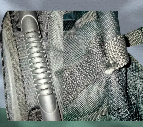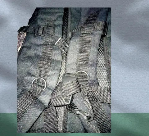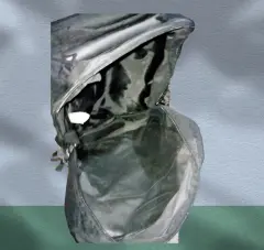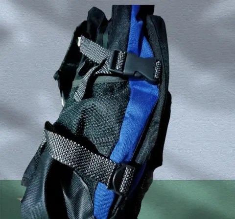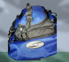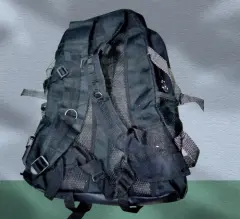 Mochila para camping.Tiene 2 bolsas exteriores, dos manijas para sostenerla, una enfrente y una arriba.Tiene broches en los lados y abajo para que tenga mayor capacidad.En ambos lados tiene una malla para poner botellas o más cosas.En la parte trasera tiene broches para ajustarse al pecho, así como en la cintura.Tiene un defecto de fábrica, descosida una tira de los lados. Mide 48x35x14cm