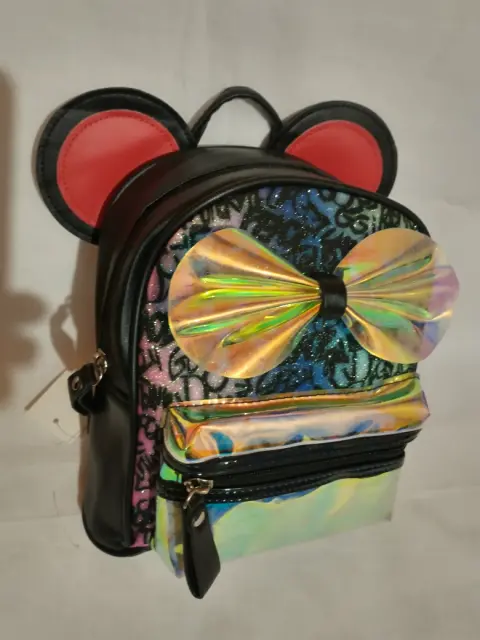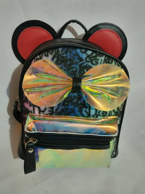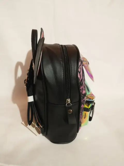 Mochila para niña de color negro y rojo con detalles en color tornasol ,con dos compartimientos, medidas de 25cm por 15cm.