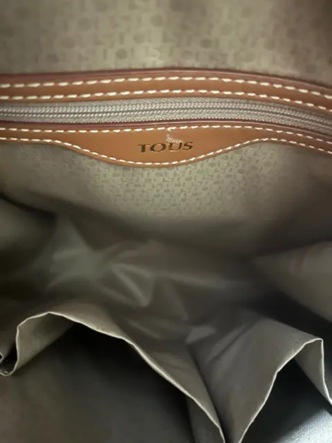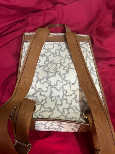 Mochila Tous colección Kaos de lona con estampado beige y gris con de talles de piel sintética, con cierre de solapa magnético, dos bolsos interiores pequeños y bolso interior con cierre de cremallera, asa fija de mano y correas de hombro ajustables. Medidas (alto por ancho por fondo): 34 x 30 x 15. Se entrega con cubre polvo.