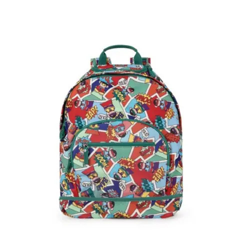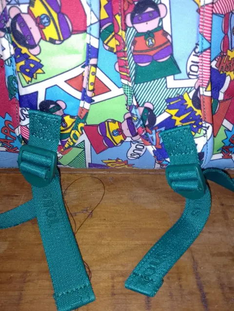 Mochila Tous School Superhero. Mochila mediana Tous School Superhero, por fuera su estética está de 10. Mide 41cm de alto, 33 de largo y la base mide 15cm de ancho.El único detalle que tiene es por dentro (tenía un forro interno como tipo lona blanco y se le fue desprendiendo poco a poco. Pero es por dentro y no se nota. No afecta en nada su uso.