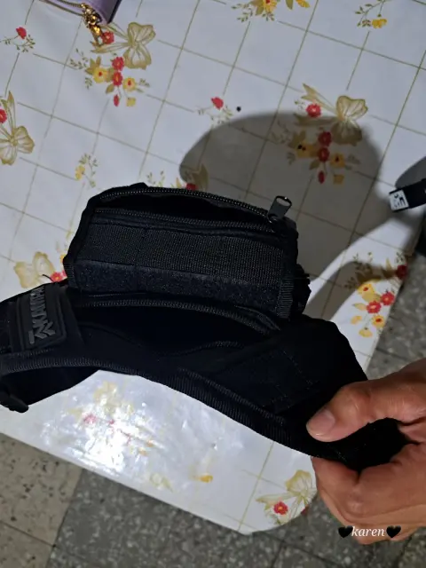 Piernera. Mochila pequeña demasiado práctica, de color negro, cuenta con 4 bolsas con cierre y 2 sin cierre