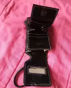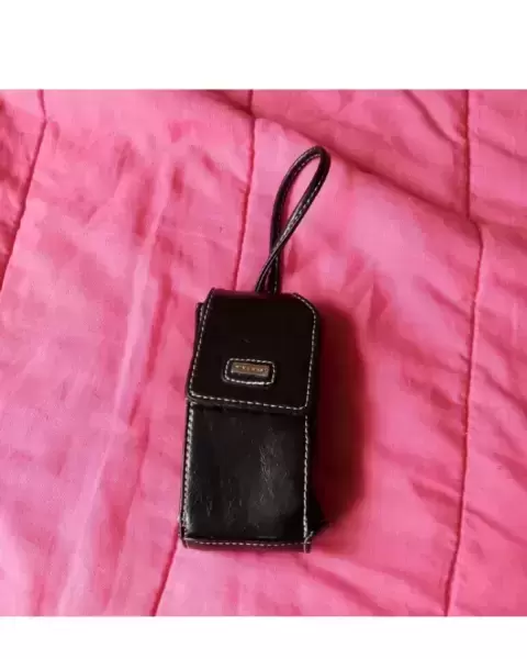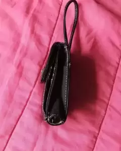 Bolsa pequeña marca Nine west color negra ideal para guardar la máscara para pestañas, bile, tarjetas cuenta con un espejo pequeño en su interior