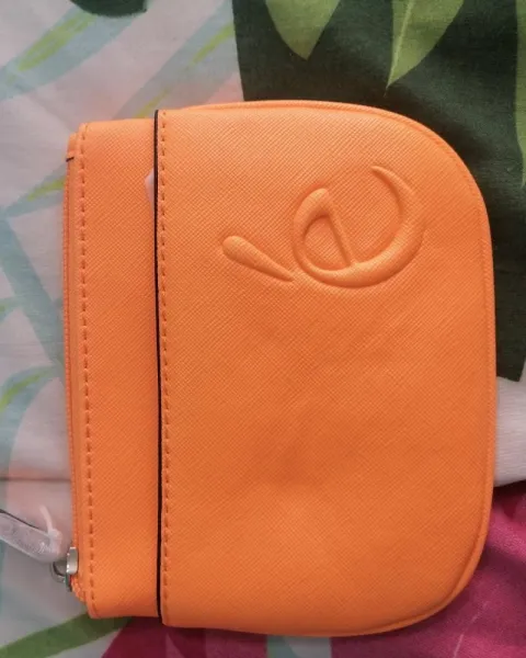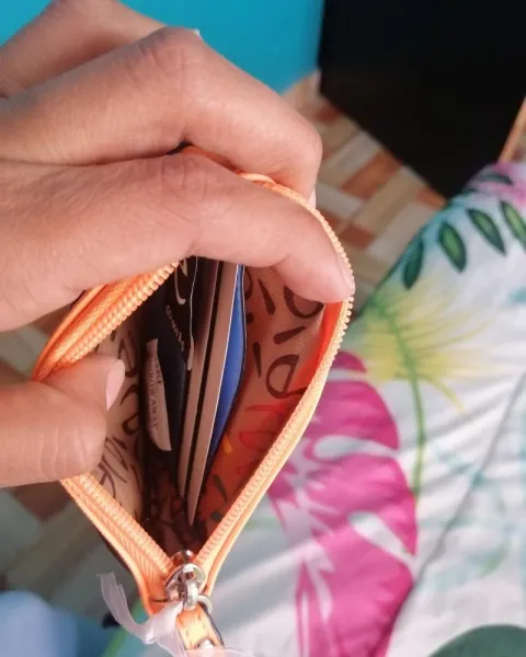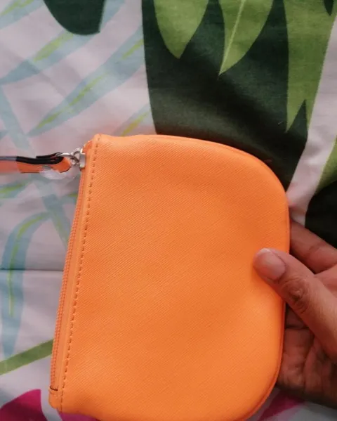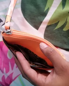 Monedero de vinipiel, anaranjado fosforescente, trae correa para usar como muñequera y adentro división para las tarjetas, bastante amplio.