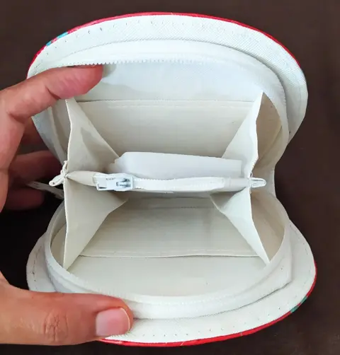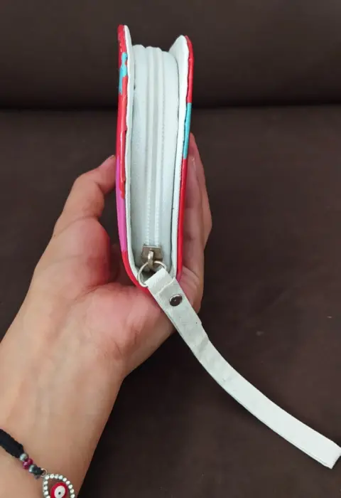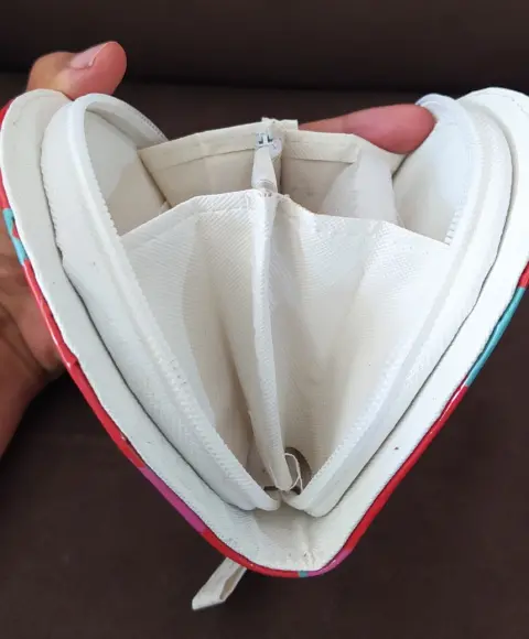 Hermoso monedero de vinilo, muy ligero y práctico, cuenta con cierre interno para guardar monedas y separaciones para billetes y tarjetas. Producto nuevo.Ancho: 14 cm.Alto: 11 cm.