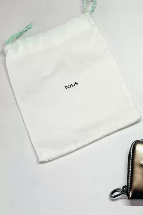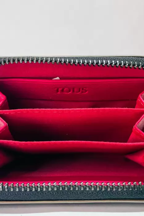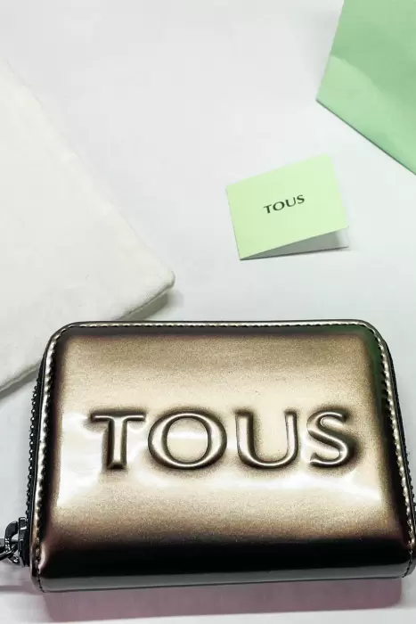 Monedero mediano TOUS en vinilo de efecto cuero y acabado charol con relieve TOUS en color ocre.Lo envío con cubrepolvo y bolsa de papel de la marca.Cierre con cremallera.Cuenta con tres compartimentos y dos bolsillos planos.Medidas: 8 x 11 x 3 cm.