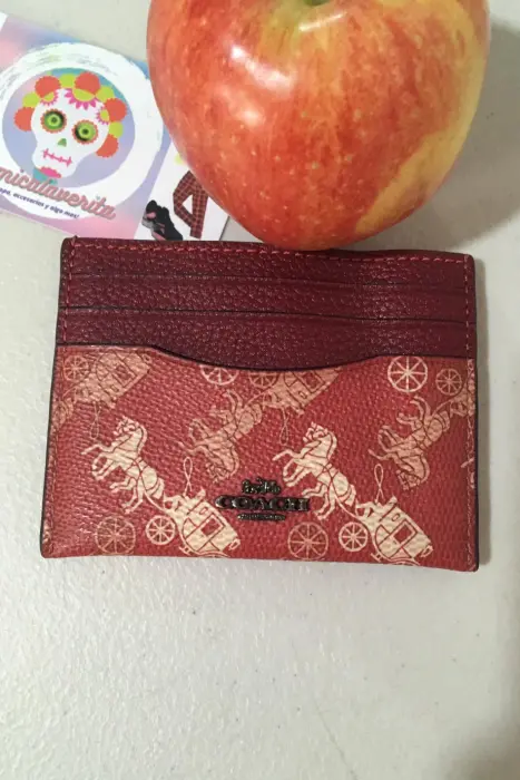 Tarjetera Coach con 6 compartimientos. Tarjetera Coach con 6 compartimientos Tarjetero Con Estampado De Caballo Y Carruaje 1984, Rojo Rojo Profundo, Tarjetero de mujer en excelentes condiciones. Lona revestida impresa y ribete de cuero granulado pulido Seis ranuras para tarjetas de crédito.