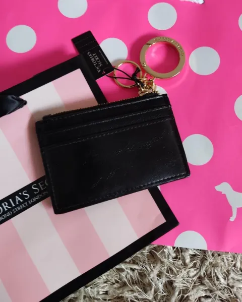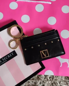 Tarjetero negro Victoria's Secret. Tarjetero negro Victoria's Secret originalDetalles de tachuelas Cierre para monedas Se puede usar de llavero o anexar a la bolsa 4 espacios para tarjetasNuevo con etiqueta