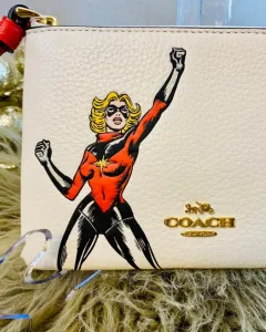 Wristlet COACH MARVEL. ❤️Hermoso wristlet COACH edición especial MARVEL (Carol Danvers). Confeccionado en cuero color blanco/rojo, asa muñequera roja, cierre y logotipo de la marca en color dorado. Medidas: 10cm alto x 16cm largo. ¡Producto nuevo con etiqueta! Bella colección para las amantes de COACH.