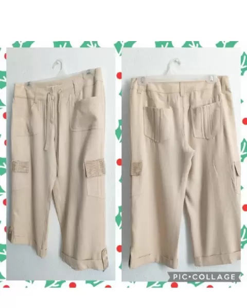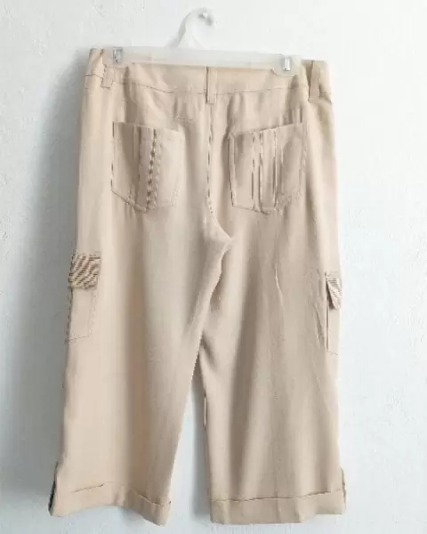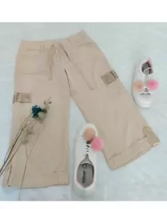Capri beige tipo cargo. Esta hermoso!Tiene diseño dorado en las bolsas, listón.Bolsas funcionalesComplemente Nuevo con etiqueta.y repuesto de botones.Saldo de tienda, tiene una ligera manchita, seguro se quita con lavada ya que se lo han probado.Talla M (sin strech)