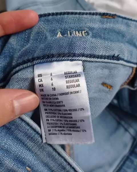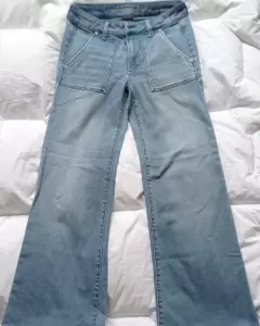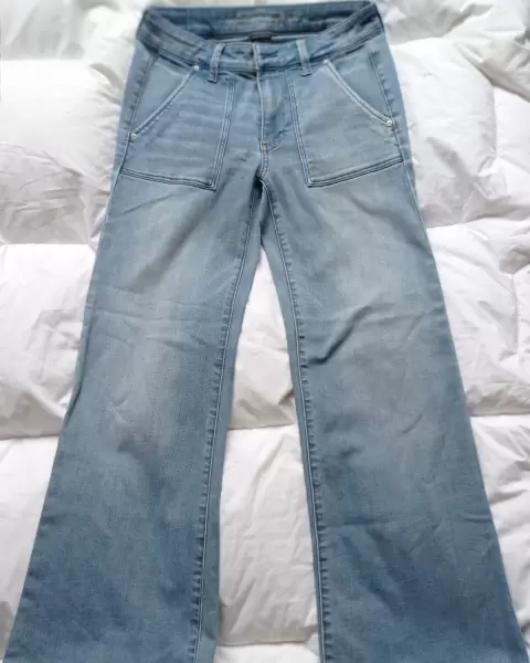 Pantalón de mezclilla clara. Talla 6, bolsillos al frente y atrás. Corte acampanado. Deshilachado de abajo, en perfecto estado. 71% algodón. Marca American Eagle. Super cómodos y hermosos.