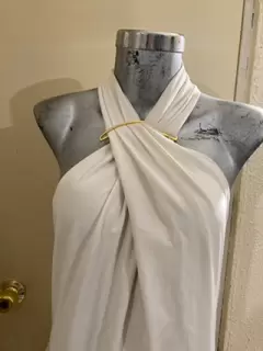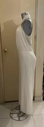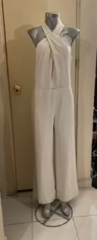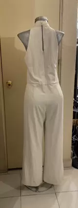 Jumpsuit beige talla chica, cuello cruzado con adorno dorado, cierre en la espalda