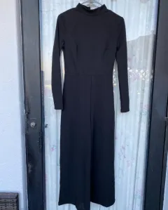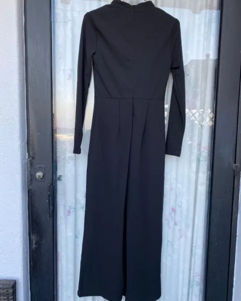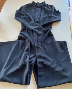 Enterizo con manga larga y cuello alto. Piernas amplias en largo abajo de las pantorrillas, tipo Coulote. Con cierre en la espalda