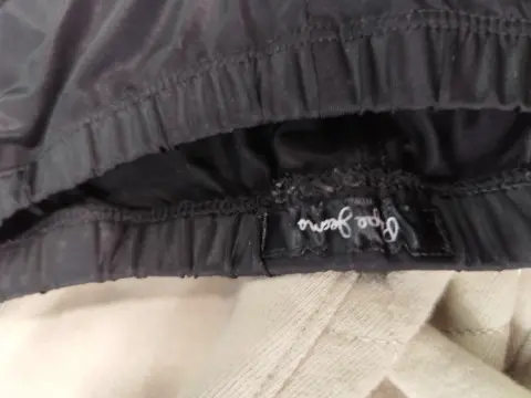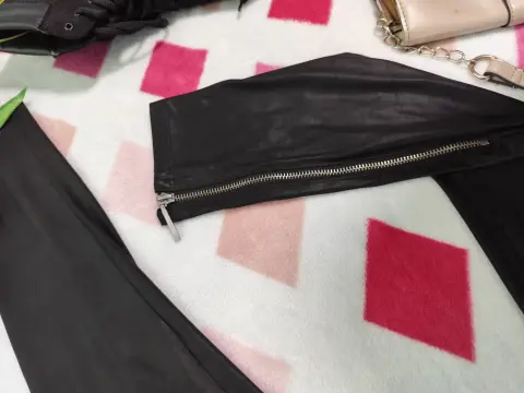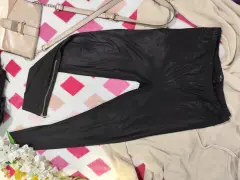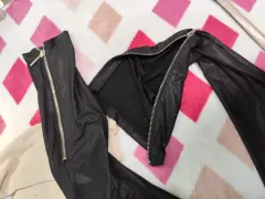Leggings satinado negro. Tela ligera, delgada, Stretch, amolda al cuerpo. Elástico en cintura, tiro alto. Cierres en la parte de abajo, abren.
