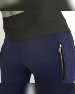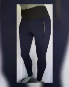 Leggings de vestir color AZUL ÁCERO, c/elástico tono NEGRO ÉBANO en cintura para mejor ajuste, 2 cremalleras simuladas color DORADO. Talla 30. Dimensiones cms: 39 (da hasta 46) cintura, 45 cadera, 18 tiro, 23 pierna, 94 largo. 70% poliéster, 30% viscosa. Para lavado en casa.***NO ES PARA EJERCICIO***