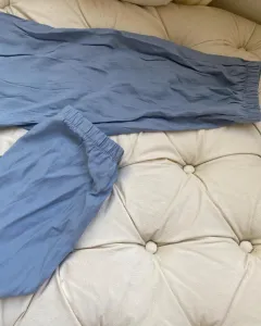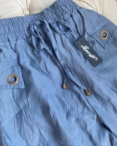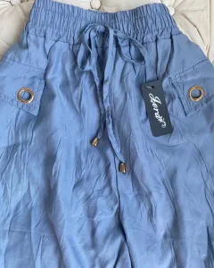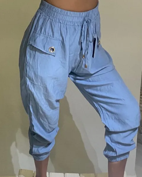 ❤️NUEVO JOGGER. Pantalón jogger con jareta y elástico en la cintura que permite usar desde una talla XS hasta G, azul pastel en tela corrugada súper fresca, comodisimos, ojillos de metal en los bolsillos laterales simulados.