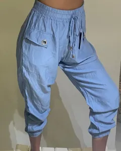 Pantalón jogger con jareta y elástico en la cintura que permite usar desde una talla XS hasta G, azul pastel en tela corrugada súper fresca, comodisimos, ojillos de metal en los bolsillos laterales simulados.