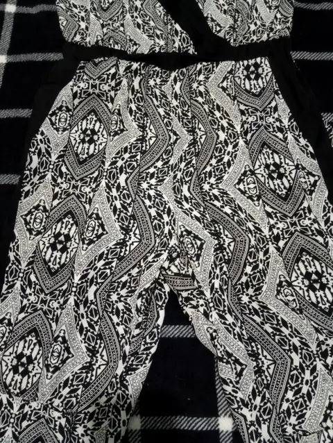 Palapzo. Blanco con negro floreado bonito escote en v y elegante banda al costado ideal para estas fiestas